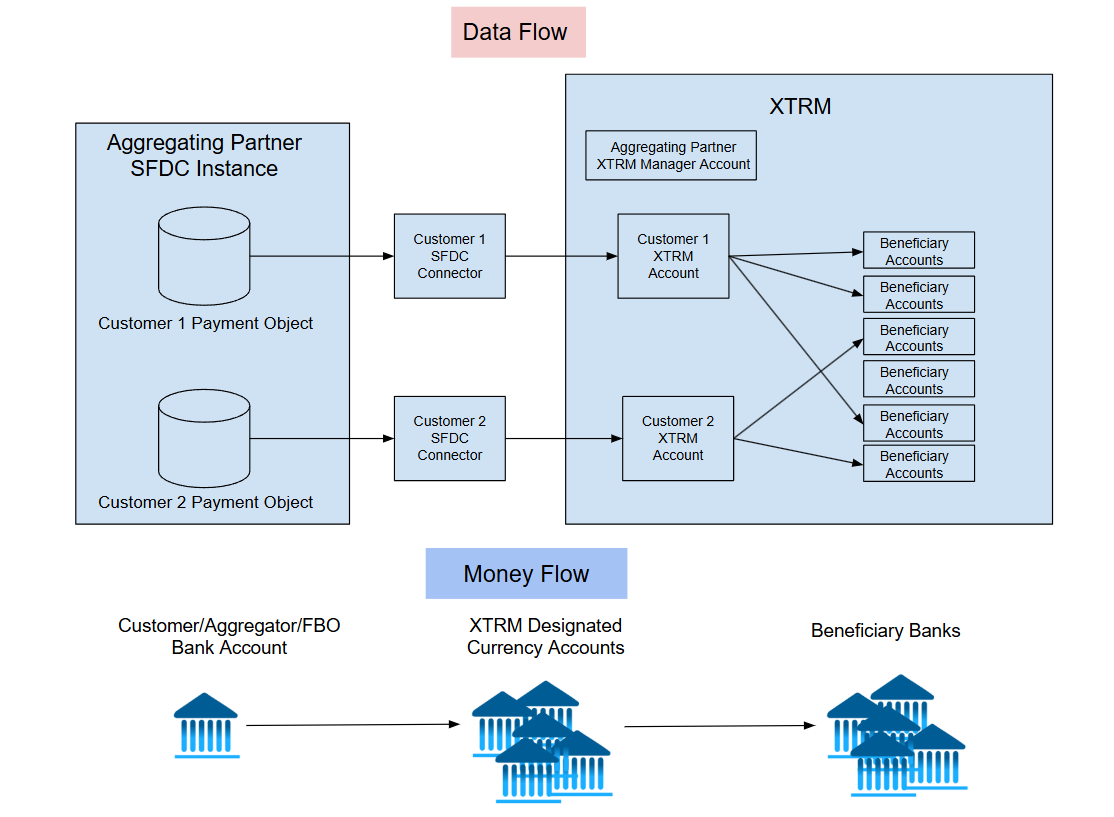 A company can create Xtrm payment records within their Salesforce instance and supply Xtrm with the credentials it needs to use the regular Salesforce API to read new (unprocessed) records at a set time interval (typically twice per day). Xtrm can then update the payment record transaction IDs, processed time, and payment status in the data fields reserved for Xtrm's usage.