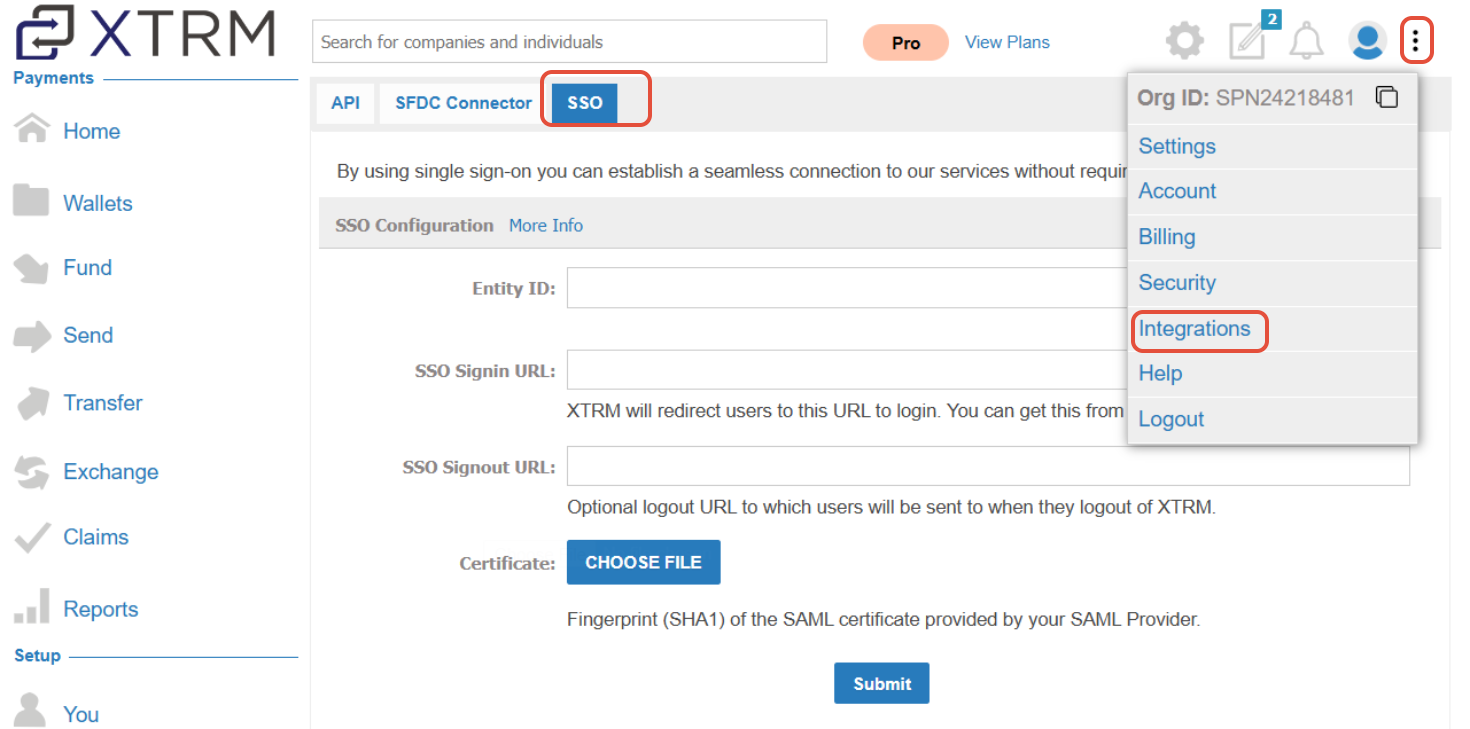 To use Xtrm SSO, please log in to your company account and go Integrations from the Ellipsis (three dots) located in the top far right corner of the screen. You will see this screen to start the configuration.