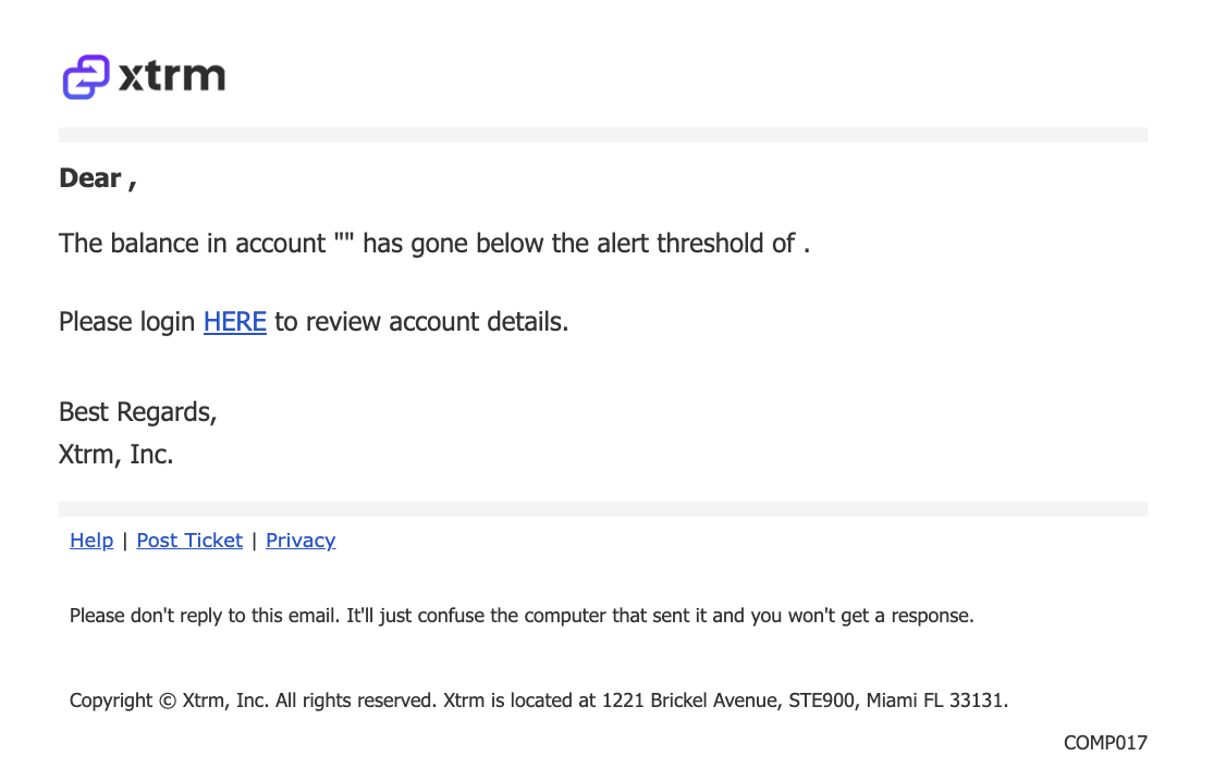 The wallet owner receives an email notification indicating that the balance has fallen below the threshold.