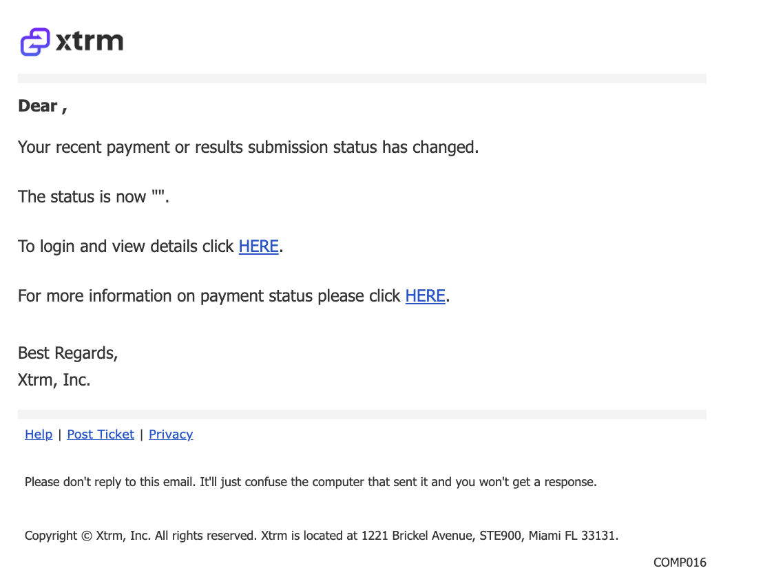 This document outlines the process and notifications associated with status changes for mass payment submissions.