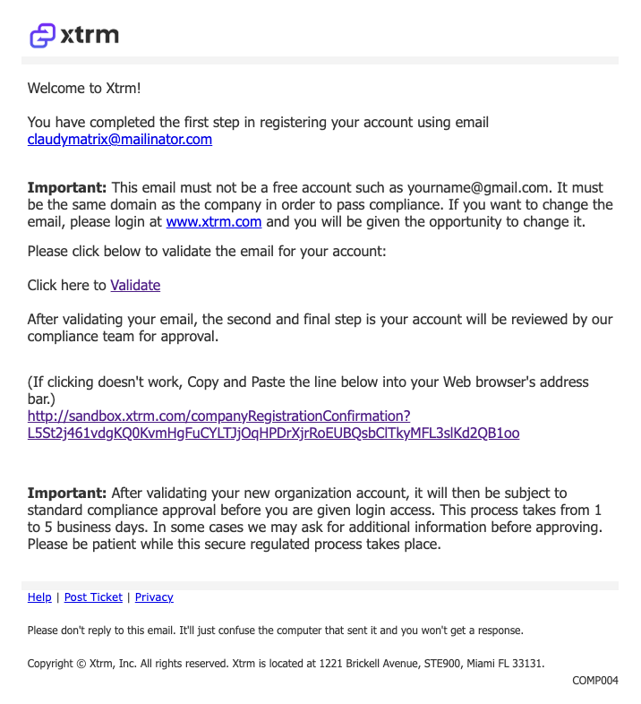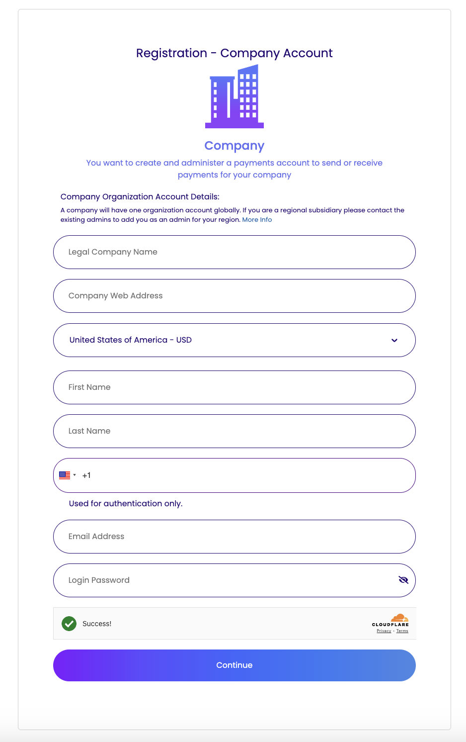 Note: Use an email associated with your company's validated website domain. Avoid consumer email domains (e.g., @gmail.com, @yahoo.com) to ensure successful registration.