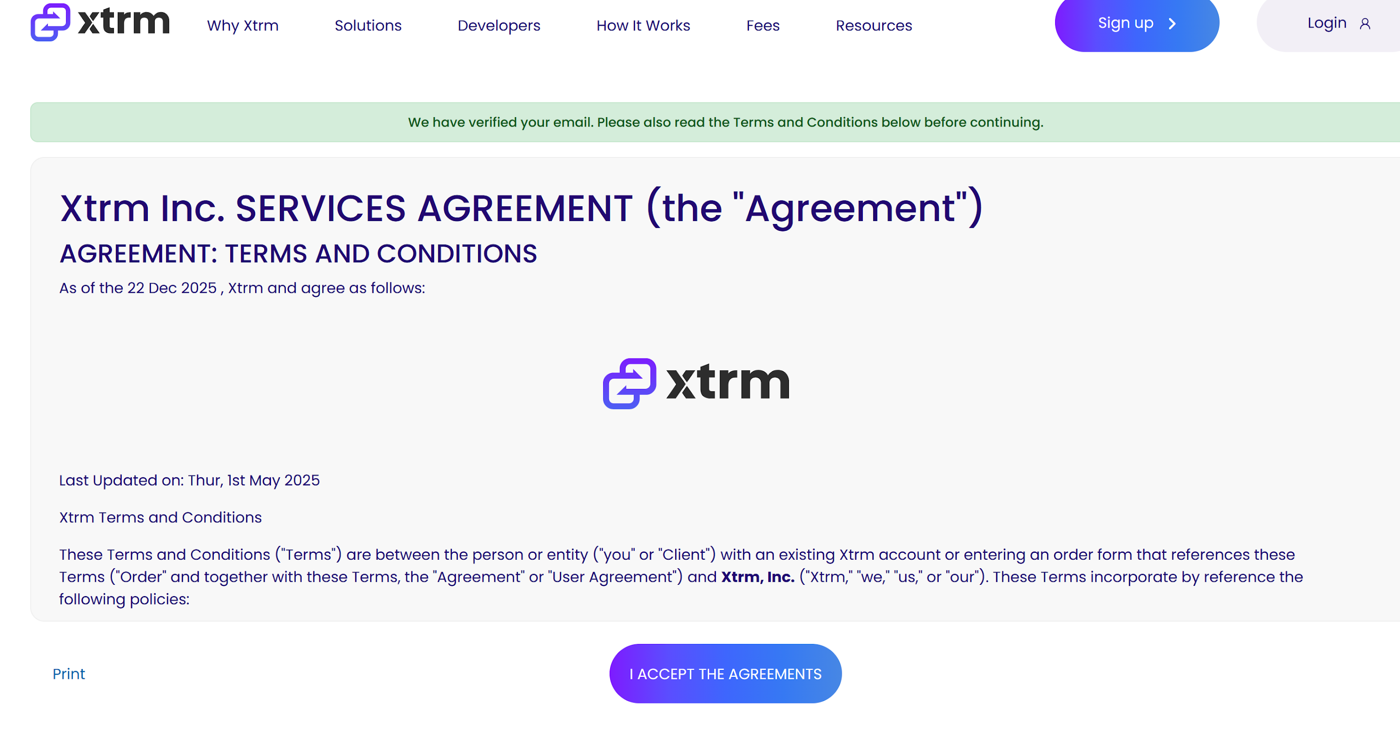 7. Review and accept XTRM's Services Agreement, which includes the Terms & Conditions and Privacy Policy