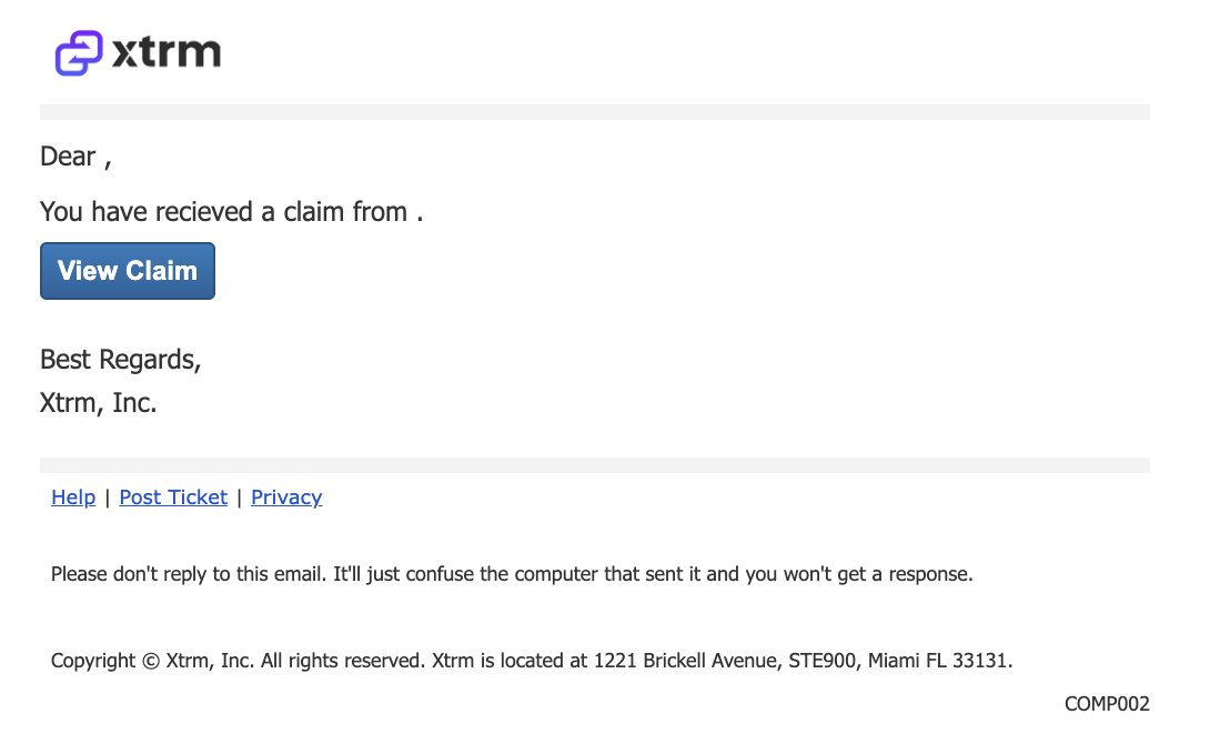 When a company that uses claims to process incentives receives a claim for payment, Xtrm sends an email notification to alert them that a claim has been submitted. This ensures that the company is immediately informed and can take the necessary steps to review and process the payment.